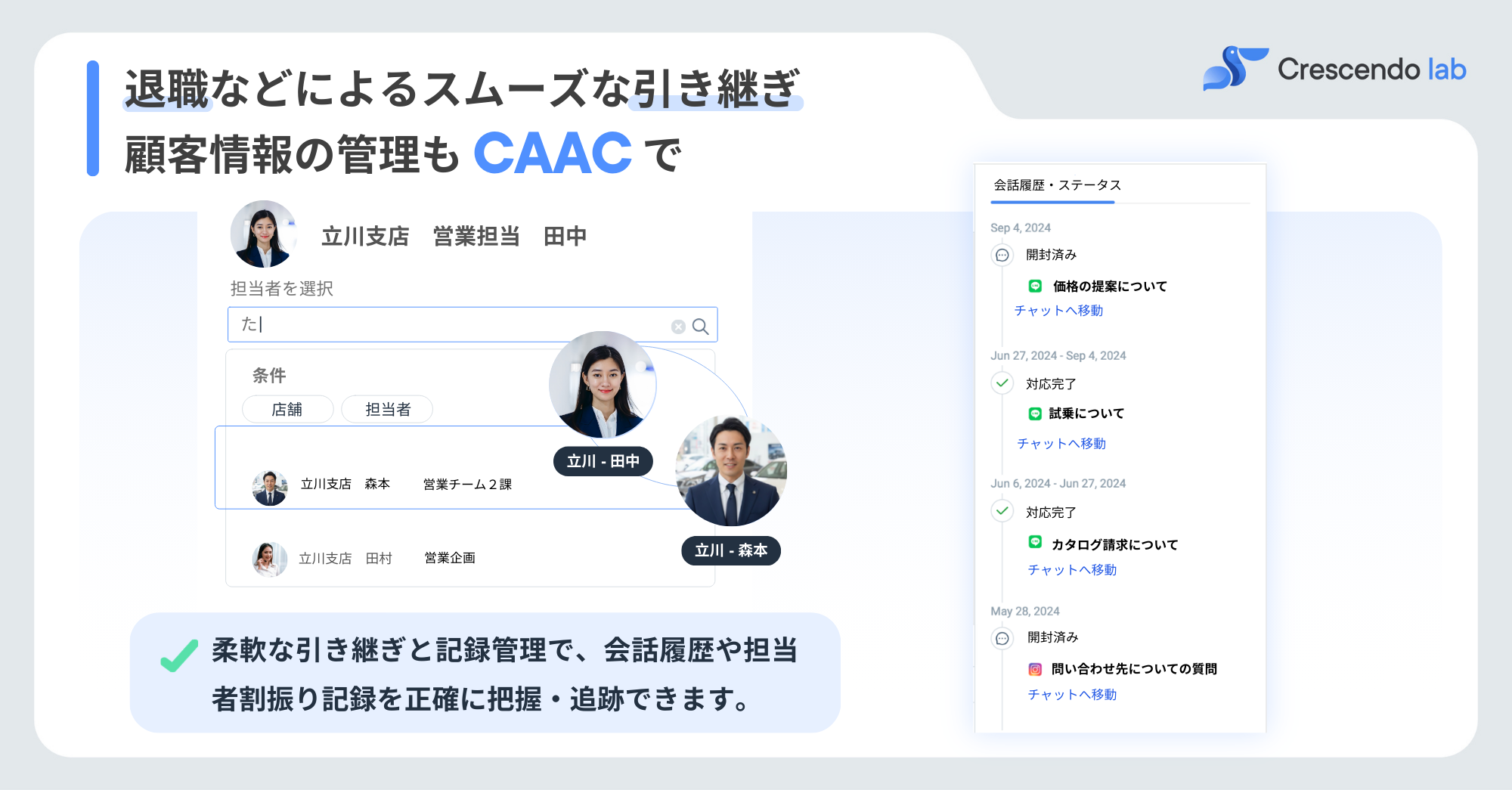 柔軟な引き継ぎと記録管理により、会話履歴や担当者割り振り記録を正確に追跡できます。属人化しやすいコミュニケーションを「店舗の資産」へと変え、長期的なLTV(顧客生涯価値)向上に貢献します。