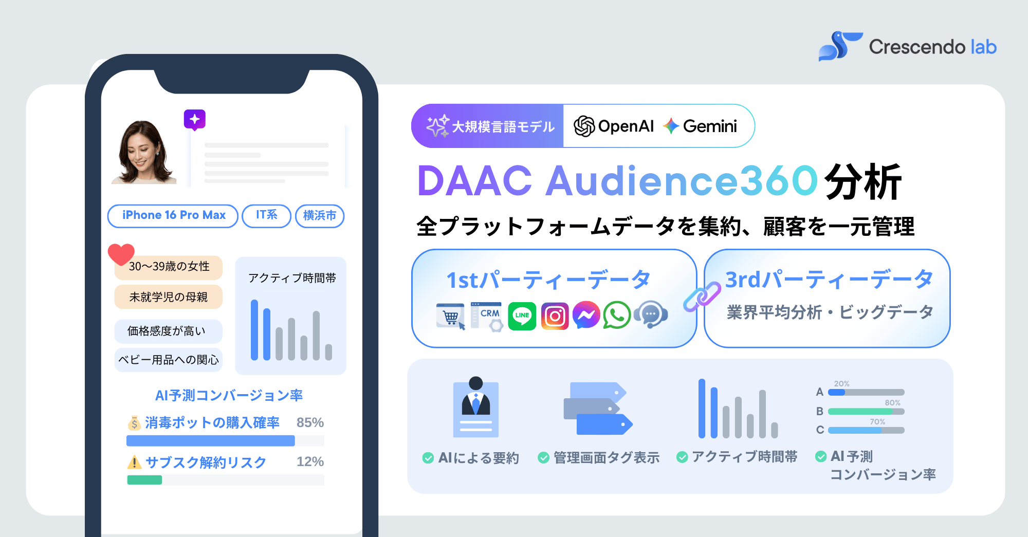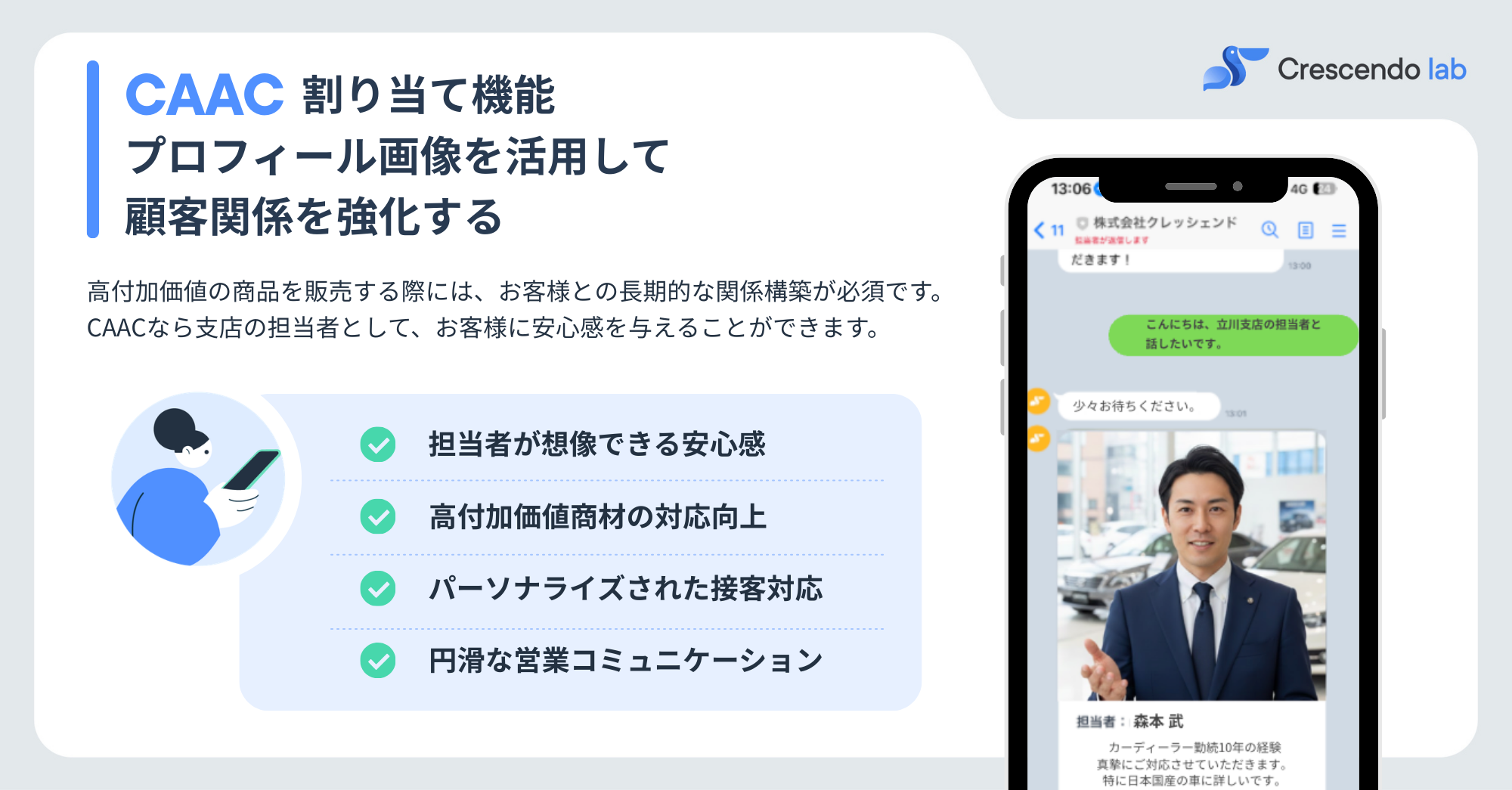 私たちクレッシェンドラボは、メッセージングを通じた「会話型」プラットフォームを提供しており」、中小企業からグローバル企業までで多くの企業の営業変革を支援しております。