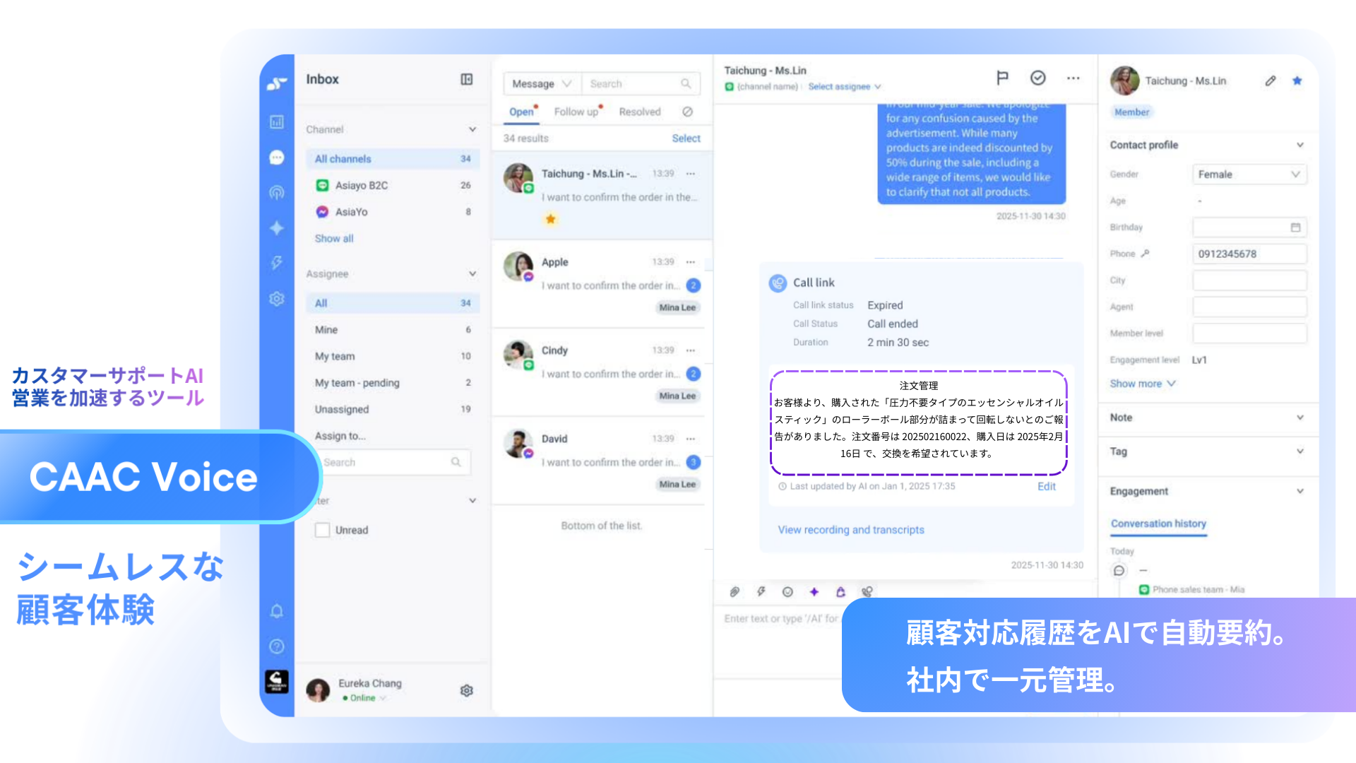 - ソリューション: CAAC Voice が通話内容を自動で録音・文字起こしし、AIが要約を生成します。