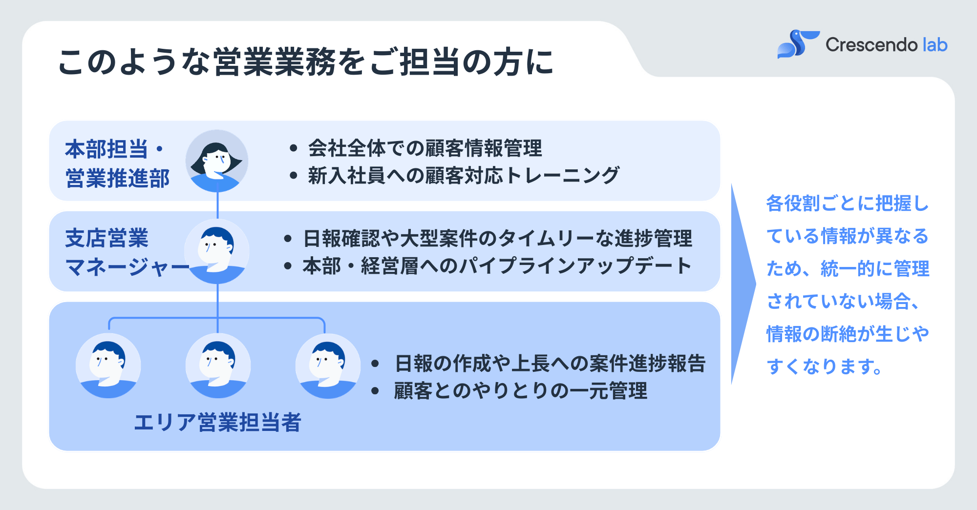 といった営業の属人化は、売上機会の損失だけでなく、組織の透明性を失わせる大きなリスクとなります。