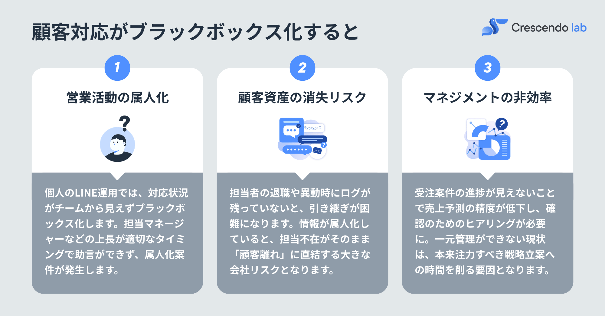 ここも大きなリスクとなりうる原因です。担当者が退職した際、過去のやり取りが一切残っていなければ、引き継ぎは困難を極めます。経済産業省のDXレポートでも、データの利活用ができない企業の競争力低下が指摘されています。情報が属人化していると、担当者の不在がそのまま「顧客が離れる」リスクに直結します。