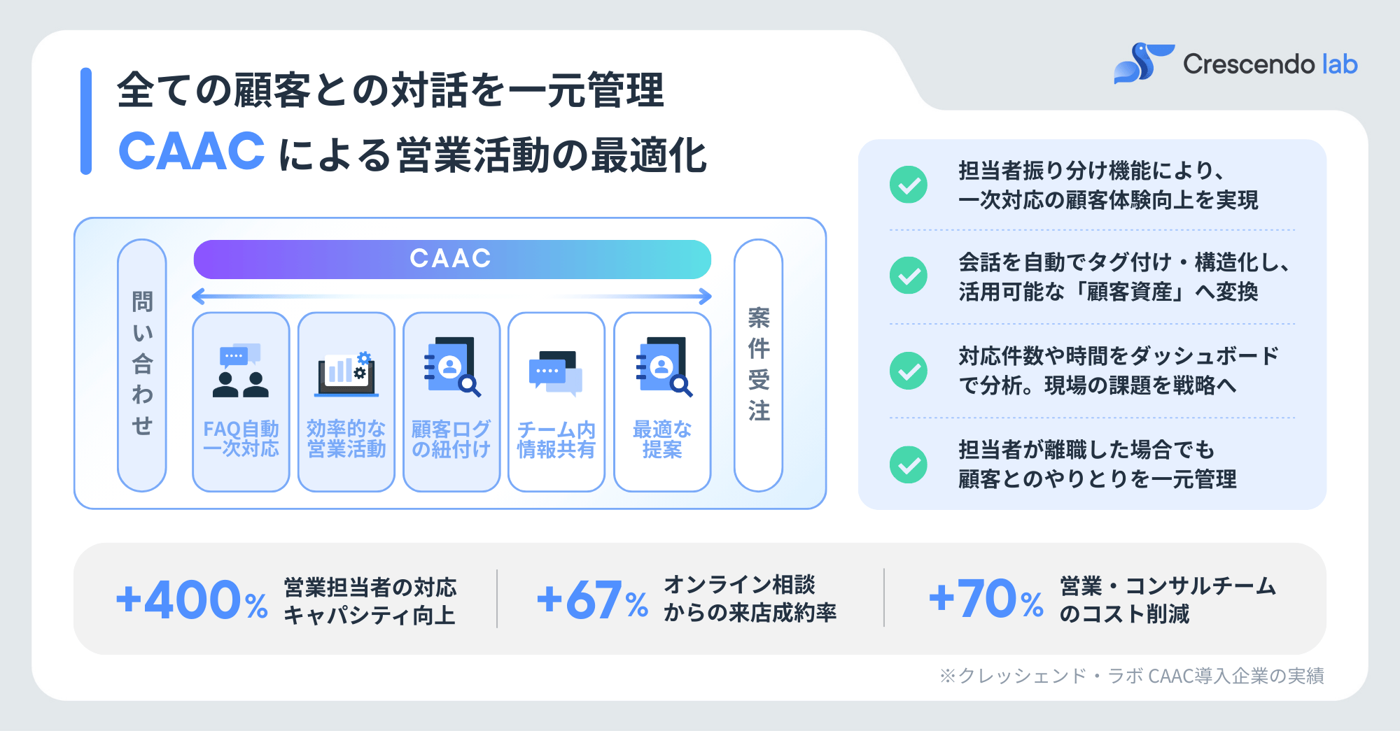 Q1:CAACは既存のCRMと連携できますか? :はい、API連携等を通じて既存の顧客管理システムとデータを同期させることが可能です。