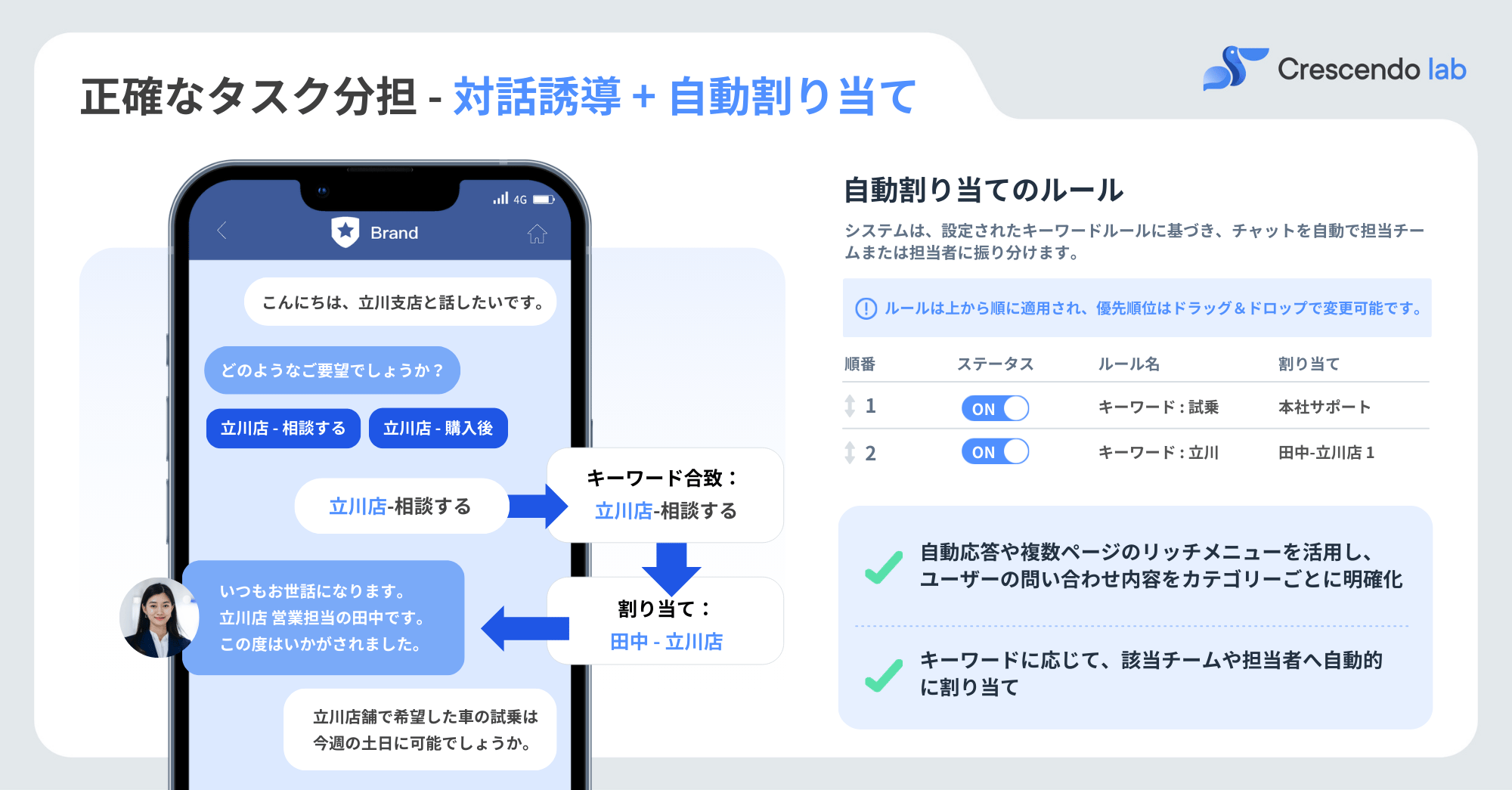 顧客の居住エリアや過去の購入履歴に基づき、最適な店舗やスキルを持つスペシャリストへ瞬時にパスを回すことが可能です。