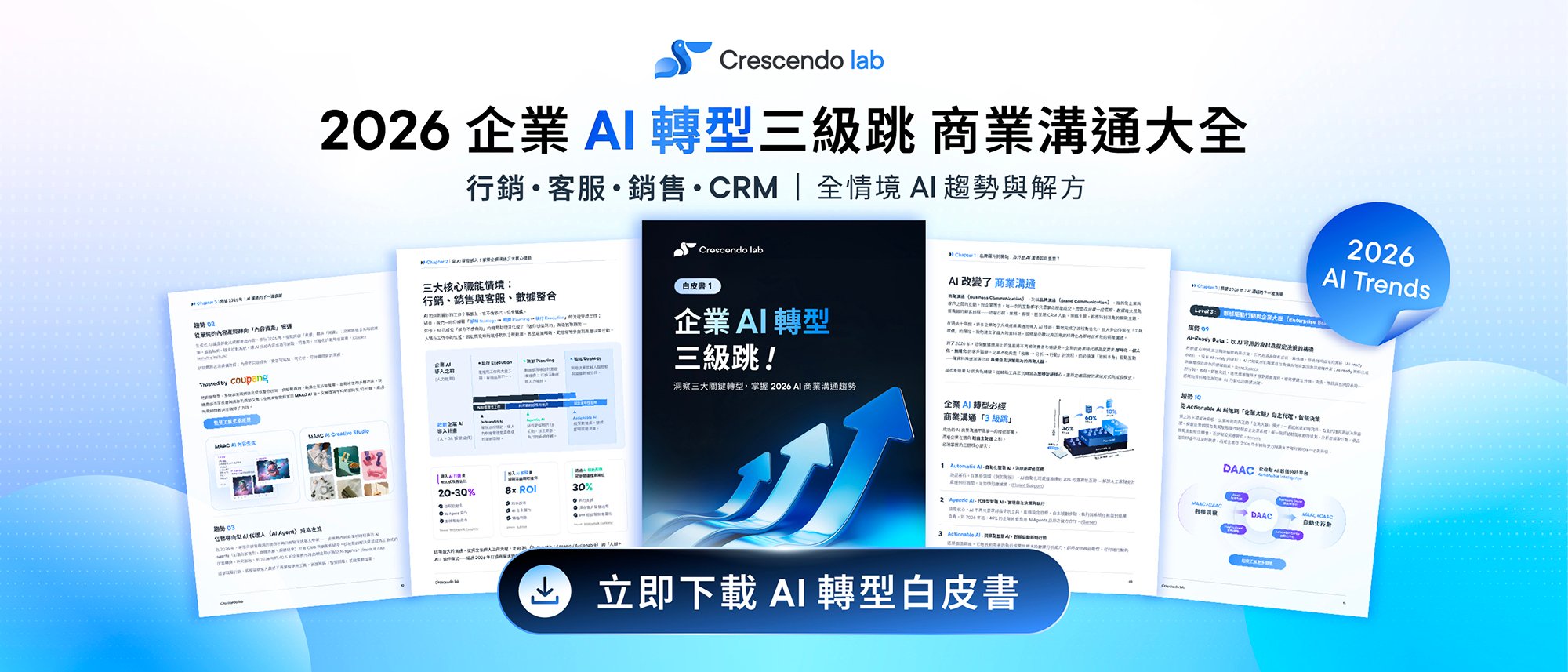 如果你也想進一步了解,企業該如何循序導入 AI、建立跨部門的轉型策略,漸強實驗室《企業 AI 轉型 3 級跳》白皮書系列,將從客戶溝通的視角,帶你看見 AI 在行銷、客服、銷售與數據分析中的最新趨勢及應用情境。點擊下方圖片,填寫表單即可免費下載!