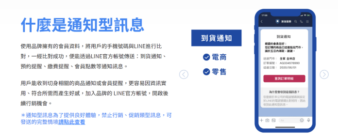 若 LINE 官方帳號經營者/品牌擁有會員的手機號碼,即能透過 LINE 官方帳號傳送:到貨取貨通知、繳費提醒、預約提醒、會員點數等通知型訊息。會員收到切身相關的商品通知或會員提醒時,更容易因資訊實用、符合所需而對品牌產生好感,因而更有動機加入 LINE 官方帳號好友,替品牌開啟後續行銷與互動機會。